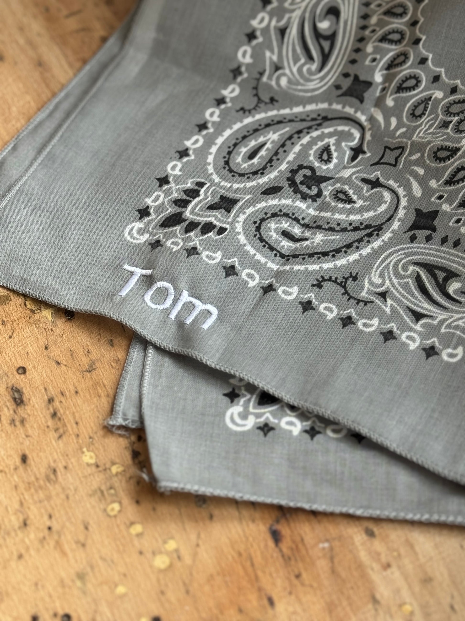 Nous vous proposons de personnaliser votre bandana avec une broderie : un mot doux, votre prénom, vos initiales .. (maximum 6 caractères) :