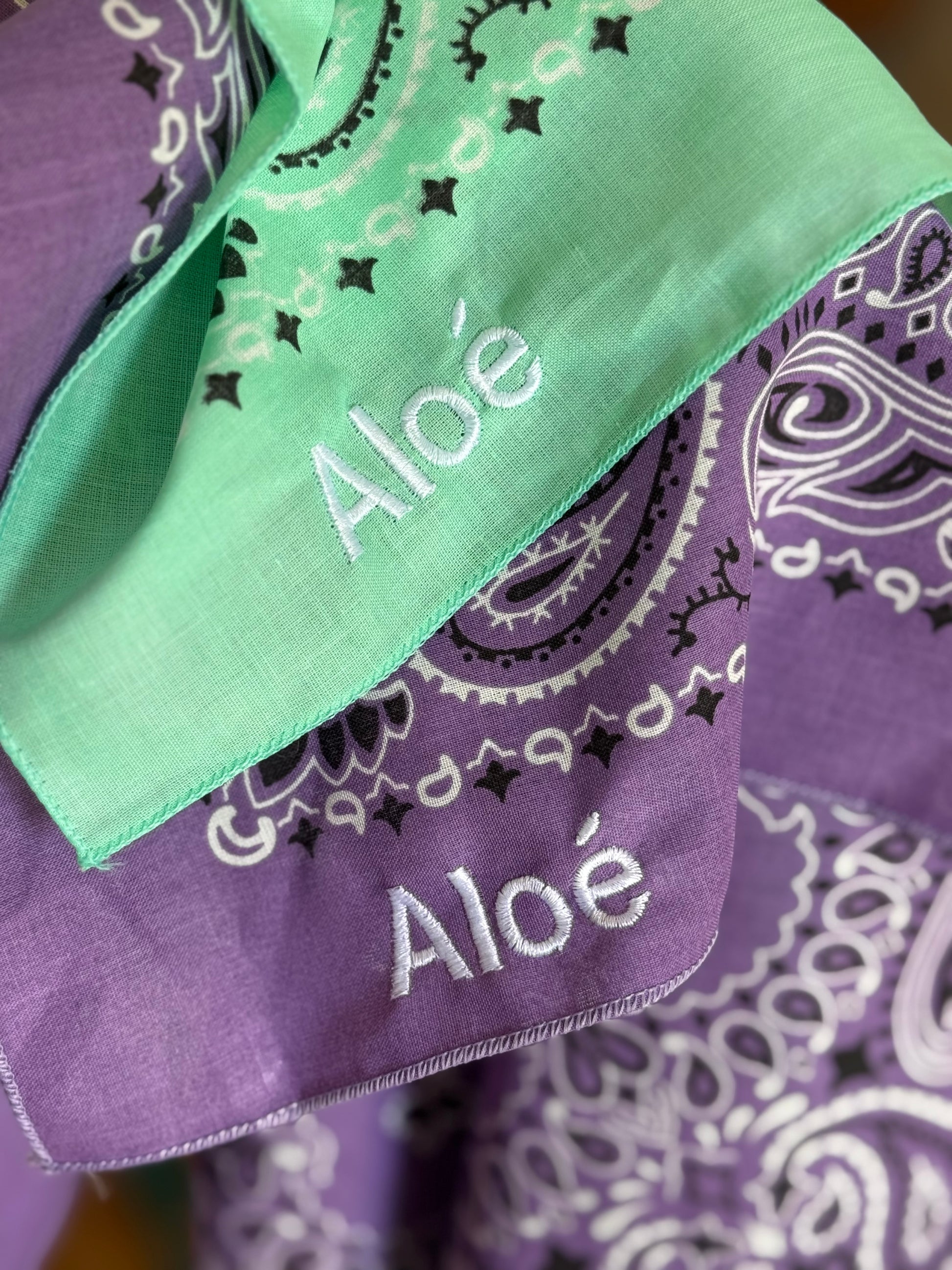 Nous vous proposons de personnaliser votre bandana avec une broderie : un mot doux, votre prénom, vos initiales .. (maximum 6 caractères) :