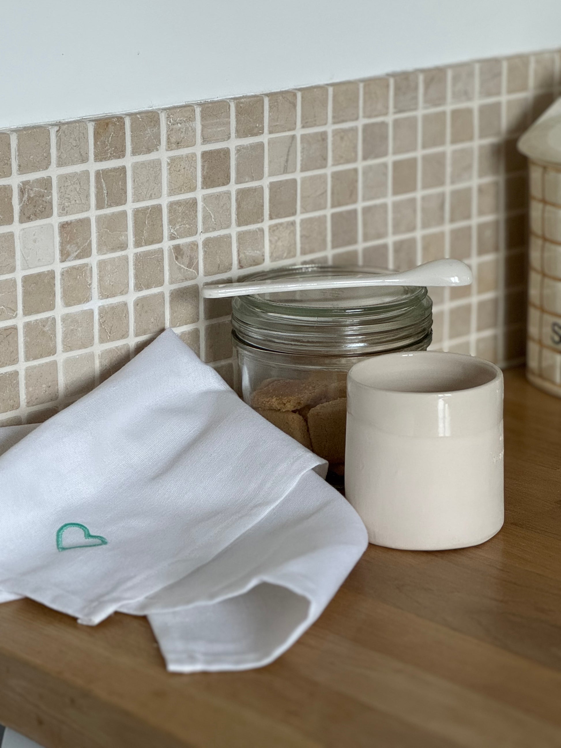 Notre set se compose de notre gobelet en céramique ma passion et d'une serviette de table en lin/coton brodée d'un petit cœur au fil de broderie turquoise ou lila.